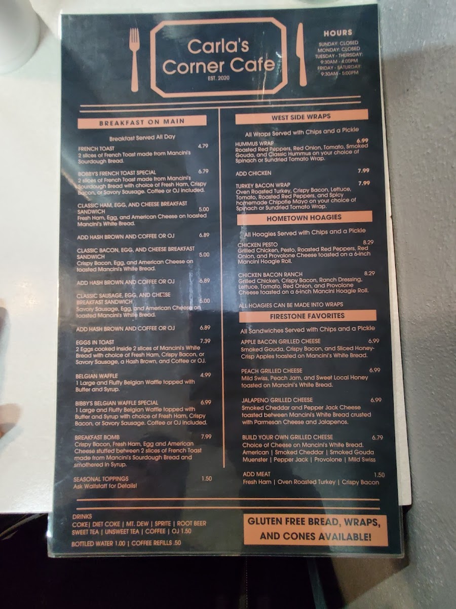 With affordable prices and friendly service, Carla's Corner Cafe isn’t just about food; it’s about feeling at home. Don't miss this charming gem!